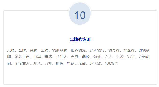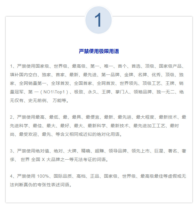 我們?cè)谥谱骶W(wǎng)站、小程序的商品標(biāo)題、頭圖、詳情頁(yè)、推文等商品信息的時(shí)候,除了制造賣點(diǎn)吸引消費(fèi)者外,還需要注意避開一些廣告法禁止的宣傳用語(yǔ),避免中招。